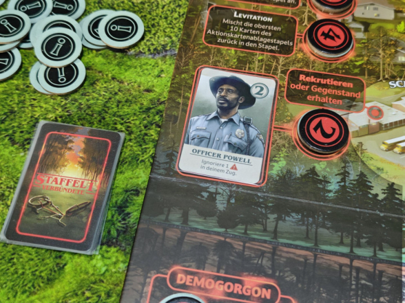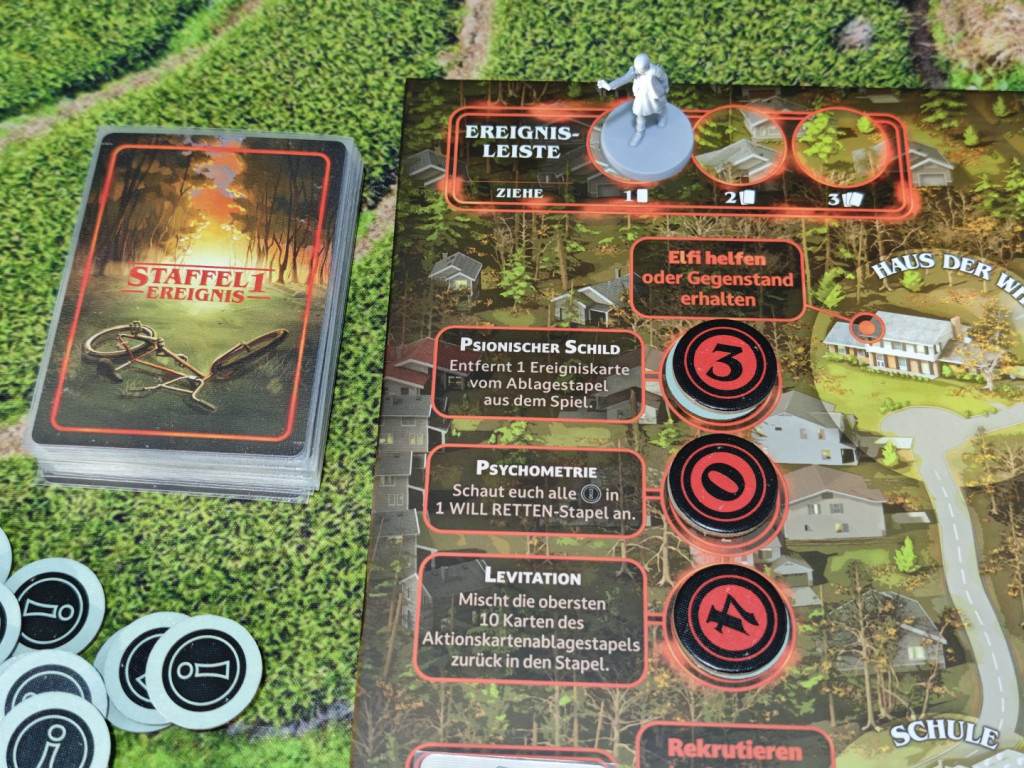 In Staffel 1 gibt es fünf Aktionen mit Probe. In der Schule und im Haus der Byers kann man „Rekrutieren“. Bei Erfolg darf man sich die entsprechende Verbündeten-Karte nehmen, die fortan durch ihre Sonderfähigkeit deine Erfolgschancen massiv erhöhen wird. Hoffentlich. Das Labor in Hawkins kann man „untersuchen“, um in Zukunft immer ein zusätzliches Ausrufungszeichen auf Aktionskarten ignorieren zu können – Ausrufungszeichen sind schlecht und erhöhen die Anzahl zu ziehender Ereigniskarten am Zugende. Eine besonders wichtige Aktion, die strategisch clever eingesetzt werden sollte, ist „Elfi helfen“. Gelingt die Probe, darf man eine in der aktuellen Partie noch nicht genutzte Kraft von Elfi triggern. Dabei stehen im Labor in der Schattenwelt und im Haus der Wheelers jeweils drei verschiedene Kräfte zur Verfügung, deren Verwendung spielentscheidend sein kann. Elfi wäre nicht Elfi, wenn sie sich nicht revanchieren würde. Dann wäre noch die Aktion, auf die man während der gesamten Partie hinarbeitet: „Will retten“. Diese gibt es an drei verschiedenen Orten. Erst wenn die entsprechende Probe an allen drei Orten gelungen ist, gewinnt man die Partie.