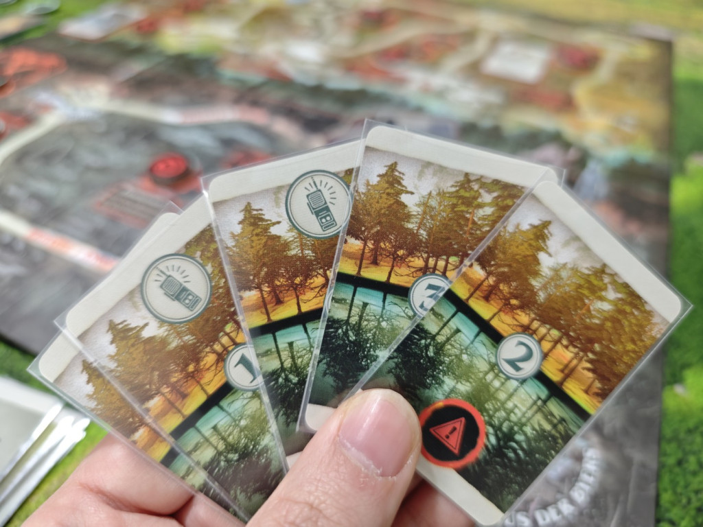 Nun werden die Ereignis-, Gegenstands- und Aktionskarten separat gemischt und als verdeckte Nachziehstapel neben den Spielplan platziert. Jeder Spieler zieht fünf Aktionskarten vom Stapel. Jede Aktionskarte zeigt Zahlen von 1 bis 3. Die Summe gespielter Aktionskarten für eine Aktion entspricht dem Aktionswert, der, wie ausgeführt, den Stapelwert der Levelplättchen übersteigen muss, um eine Ortsaktion erfolgreich auszuführen.