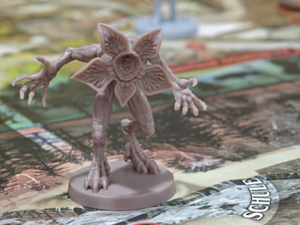 Auf mit Zahlen gekennzeichnete Levelfelder werden Stapel mit der angegebenen Anzahl Levelplättchen platziert. Dann wird immer das oberste Plättchen aufgedeckt, sodass man zu Spielbeginn etwas mehr Informationen zur Verfügung hat. Sieben Levelplättchen werden mit fünf Demogorgon-Plättchen gemischt und dann drei Stapel zu je vier Plättchen neben drei Orte platziert, an denen man die Aktion „Will retten“ ausführen kann. Demogorgon-Plättchen fungieren als variable Zahl für den Stapelwert, die durch die Anzahl an Stapeln im Demogorgon-Bereich bestimmt wird (von 0 bis 8 und zu Spielbeginn 4). Wird der Demogorgon bekämpft, kann man ihn schwächen und so Stapel aus diesem Bereich entfernen, um die „Will retten“-Aktion zu erleichtern. Apropos Demogorgon: Die Demogorgon-Miniatur kommt zu Spielbeginn auf die Schule in der Schattenwelt. Neben dem Demogorgon machen euch auch die Streifen das Leben schwer. Jeweils eine Streife wird auf die Orte Burg Byers in Hawkins und das Labor in der Schattenwelt platziert.
