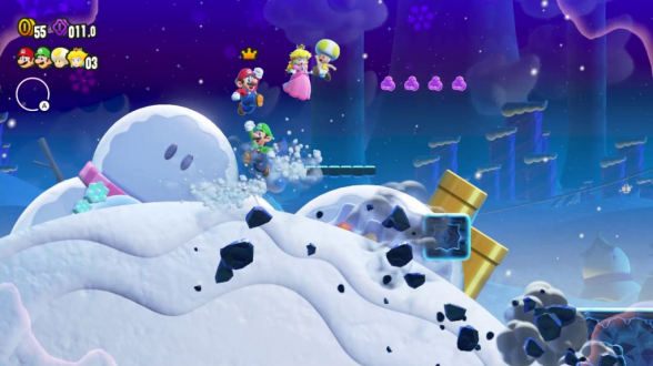 Wer schon einmal eines der klassischen 2D-Jump'n Runs von Super Mario gespielt hat, findet sich sofort zurecht. Man wählt einen von vielen verschiedenen Figuren (darunter Mario, Luigi, Prinzessin Peach, usw.) aus und rennt, hüpft, fliegt oder schwimmt durch zahlreiche Levels, die über eine Oberweltkarte miteinander verbunden sind. Alle haben verschiedene Themen (wie bspw. Wüste oder Eis) und strotzen vor witzigen oder herausfordernden Ideen. So gibt es selbstbewegende Level, Unterwasser-Level oder auch Musikabschnitte. Unterstützt wird man dabei durch freispielbare Abzeichen, die besondere Fähigkeiten oder Hilfen aktivieren. So kann man durch diese kurzzeitig fliegen oder bekommt mehr Münzen.