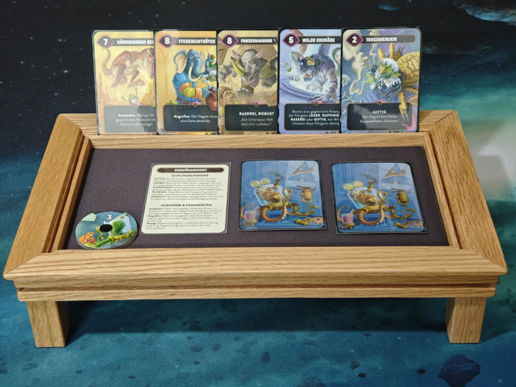Und wie wäre es mit einem Tisch pro Spieler? Der Tisch kann auch hervorragend als Spieler-Tableau zur Organisation des persönlichen Spielermaterials verwendet werden. Ok, zugegeben, es wäre schon etwas dekadent vier oder fünf dieser Tische zu besorgen, um die gesamte Spielrunde zu versorgen. Oder vielleicht doch nicht? Wir wollen hier niemanden verurteilen! Drücken wir es so aus: für Solo-Spieler ist die Verwendung als Spieler-Tableau definitiv eine Option. Hier liefert die innere Leiste des Tisches zum Beispiel die Möglichkeit Karten aufzustellen: etwas versetzt passt eine Hand aus 5 Karten entlang der langen Seite des Tisches. Aber es lassen sich natürlich alle vier Seiten verwenden! Und die Karten-Rails sind sogar zugänglich, wenn die Spielfläche abgedeckt ist. Außerdem ist sie breit und tief genug, um auch Plättchen oder dickere Tableaus einzuhängen.