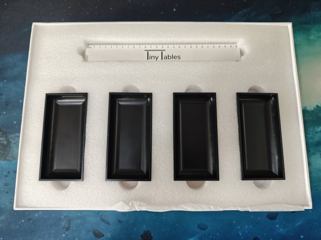 Der Tiny Table kommt in einer sehr stabilen Verpackung, die auch super zur Aufbewahrung oder zum Transport verwendet werden kann. Alle Komponenten haben gut gepolsterte Fächer. Alles sitzt fest, nichts wackelt. Öffnet man die Verpackung, findet man auf der obersten Ebene vier schwarze Plastik-Trays und ein Lineal. Diese Ebene lässt sich komplett herausnehmen. Darunter kommt dann der Tisch zum Vorschein, mit seinen vier Tischplatten. Außerdem gibt es einen Sichtschutz. Und drumherum befinden sich jeweils vier kurze und vier lange Tischbeine. Aufgebaut ist der Tisch in nur einer Minute. Tischbeine wählen, von unten via Schraubverbindung eindrehen, fertig.