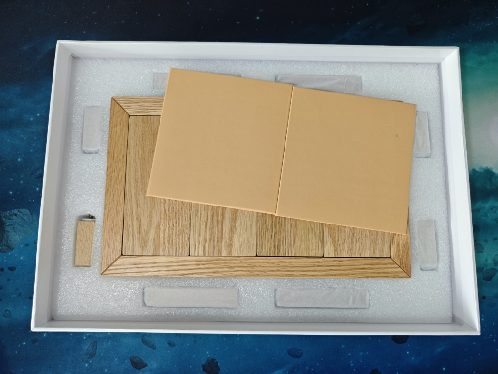 Den Tisch gibt es in vier verschiedenen Farben. Wir haben uns für die naturbelassene Variante entschieden, d.h. das Holz wurde nicht eingefärbt und hat die natürliche hellbraune Farbe der Wildeiche. Es gibt aber auch dunkelbraune, schwarze und weiße Varianten. Dem Tisch liegen außerdem insgesamt drei doppelseitige Neopren-Matten bei, sodass man für die Spielfläche zwischen sechs Farben wählen kann.