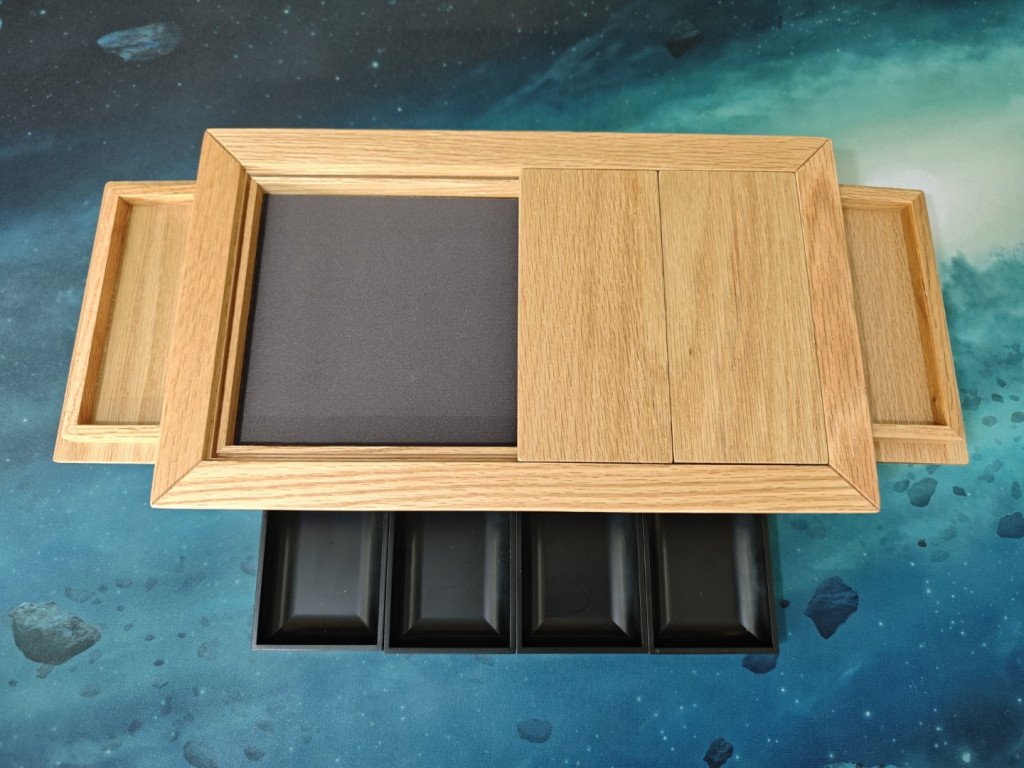 Die Verarbeitung des Tisches ist super, wir sind wirklich überrascht. Gerade in so einem kleinen Format Holz so passgenau zu bearbeiten, kann nicht einfach gewesen sein. Es handelt sich ja auch nicht um einen simplen Tisch. Vier herausnehmbare Tischplatten liegen passgenau auf einer inneren Leiste auf, die selbst auch eine Einkerbung hat. Der Tisch hat zudem auch außen eine Einkerbung zum Einhängen von Zubehör. Und tatsächlich lassen sich die vier Tischplatten umdrehen und dort einhängen, wo sie als Trays für z.B. Tokens oder Münzen fungieren können. Nun sind wir schon bei den Funktionen.