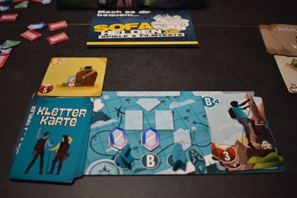 Abschließend zieht Ihr Eure Hand wieder auf drei auf und falls Eure Figur ganz oben am Gipfel bei einem Saphir steht, nehmt Ihr sie auf Euer Tableau wieder zurück. Dann ist die nächste Person an der Reihe.