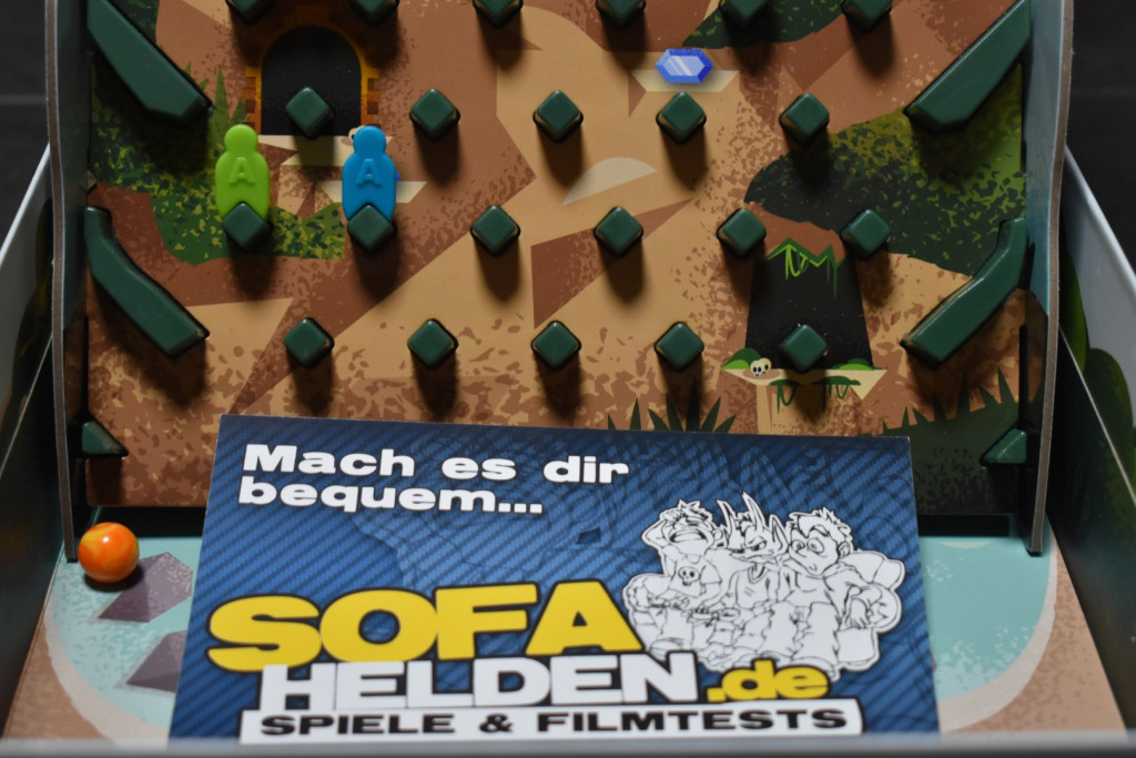 Bereits auf der Spielwarenmesse 2025 in Nürnberg sprach uns das Spiel mit seinem auffälligen Aufbau an. Der Vulkan wird aus zwei Kunststoffelementen zusammengesteckt. Beide sind mit Kartoneinlagen versehen, die den Berg grafisch dazu machen. Am Gipfel befinden sich sechs Einwürfe für die Lavakugeln. Außerdem ist der komplette Berg mit „Nubsis“ versehen, die zur Lenkung der Kugeln und als Abstellfläche für die Figuren dienen. Damit der Vulkan auch ordentlich steht, gibt es noch drei weitere Kartonelemente, mit deren Hilfe man das Ganze in der Schachtel aufbauen kann. Somit können dann auch die Lavakugeln nicht wegrollen. Hinzu kommen vier Spielerbögen, zwei eingeschweißte Kartenstapel sowie drei Zippbeutel mit Felsvorsprüngen, Figuren und den Lavakugeln. Zum Auspöppeln gibt es auch etwas, nämlich die Edelsteine, die Ihr im Spielverlauf sammeln sollt. Insgesamt macht das Spielmaterial einen sehr guten Eindruck und ist relativ robust. Dennoch sollte man gerade beim Aufbau mit den Kartonelementen aufpassen, da sich die einzelnen Schichten beim Stecken lösen können. Die Karten sind leider in Folie eingefasst und lassen sich sehr schwer auspacken. Entweder braucht man gute Fingernägel oder ein Messer.