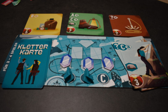 Da der Vulkan nur im zerlegten Zustand in die Verpackung passt, müsst Ihr ihn vor jedem Spiel erneut aufbauen, aber das geht sehr schnell. Alle nehmen sich ein Spieltableau und die dazugehörigen drei Figuren. Wichtig ist, dass Ihr die richtige Seite nach oben legt. Es gibt eine für zwei und eine für drei und vier Personen. Außerdem erhaltet Ihr alle noch einen Kartenstapel mit den Karten Eurer Farbe. Diese mischt Ihr und legt sie auf das Nachziehstapel-Feld Eures Tableaus. Die Ausrüstungskarten werden gemischt und verdeckt als Stapel bereitgelegt. Mit den Felsvorsprüngen und Edelsteinen bildet Ihr einen Vorrat. Abschließend nehmt Ihr Euch drei Eurer Karten auf die Hand und entscheidet, wer anfangen darf.